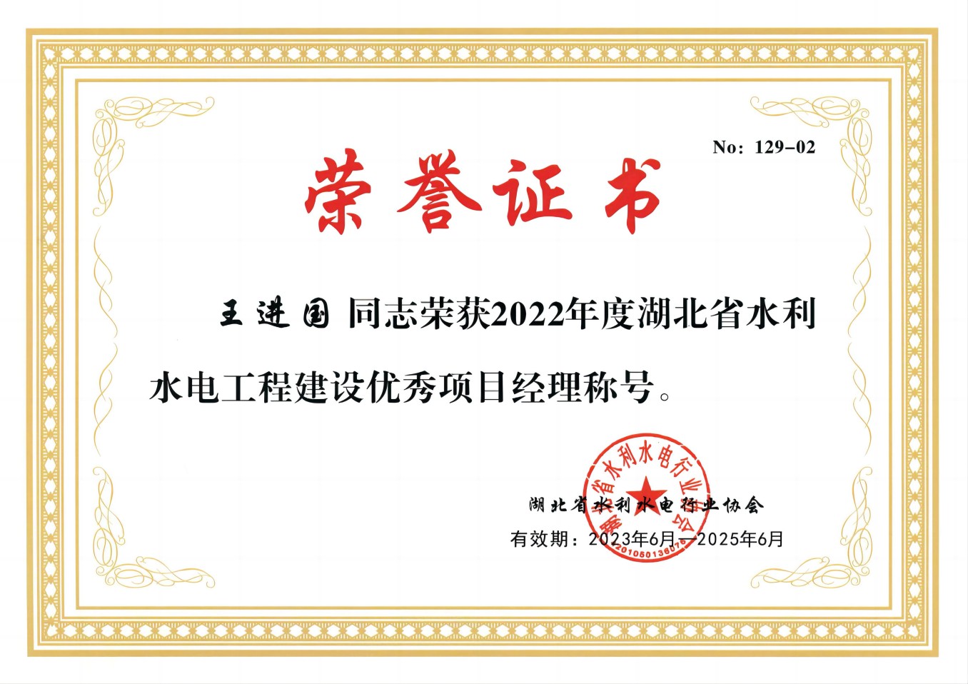 王進(jìn)國被評為2022年度湖北省水利水電工程建設(shè)優(yōu)秀項(xiàng)目經(jīng)理